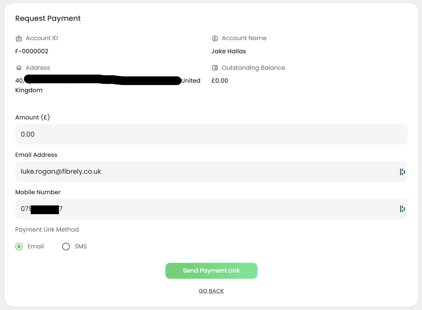 - Via a payment link - When speaking with a member of the Fibrely team, an agent can trigger a payment link to be sent via either email or text message.