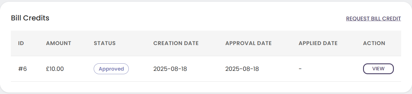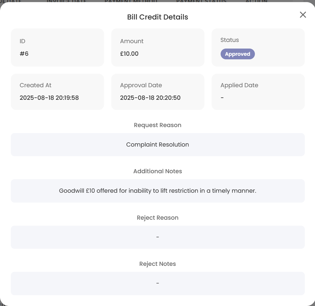 If you require more information such as the reason for the credit or why it was rejected, you can click the view action to bring up more detail.